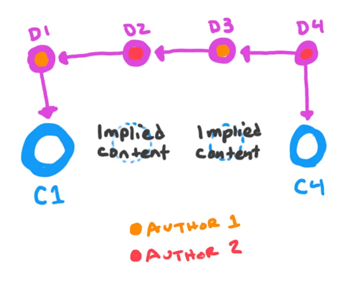Since in a distributed system we can never be sure that two agents don’t simultaneously make a new Delta off of an existing Delta, branches are impossible to prevent (and also a good thing for the user). But unfortunately, this creates a technical problem, in that branches can occur. Without designing for this, branching content would quickly silo individuals into a non-collaborative environment. A Snapshot is where we really get into the weeds of solving this branching problem.